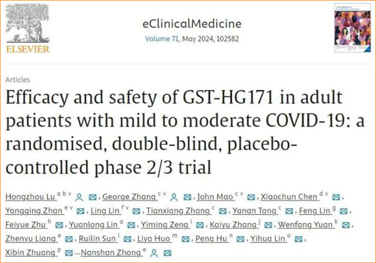 泰中定®的Ⅱ/Ⅲ期临床研究由钟南山院士和卢洪洲教授牵头开展,研究结果于2024年4月发表在《柳叶刀(The Lancet)》杂志的子刊《eClinicalMedicine》。结果显示,与安慰剂组相比,泰中定®治疗轻中度新冠病毒感染患者:有效缩短至临床症状缓解中位时间,在改良意向治疗人群(mITT)中缩短2天(P=0.031), 在XBB变异株感染亚组人群中也缩短2天;显著缩短核酸转阴中位时间,在mITT人群、XBB变异株感染亚组人群和非XBB变异株感染亚组人群中分别缩短了3天(P<0.0001)、1天(P=0.030)和4天(P<0.0001);大幅度降低病毒载量。 查看PDF原文